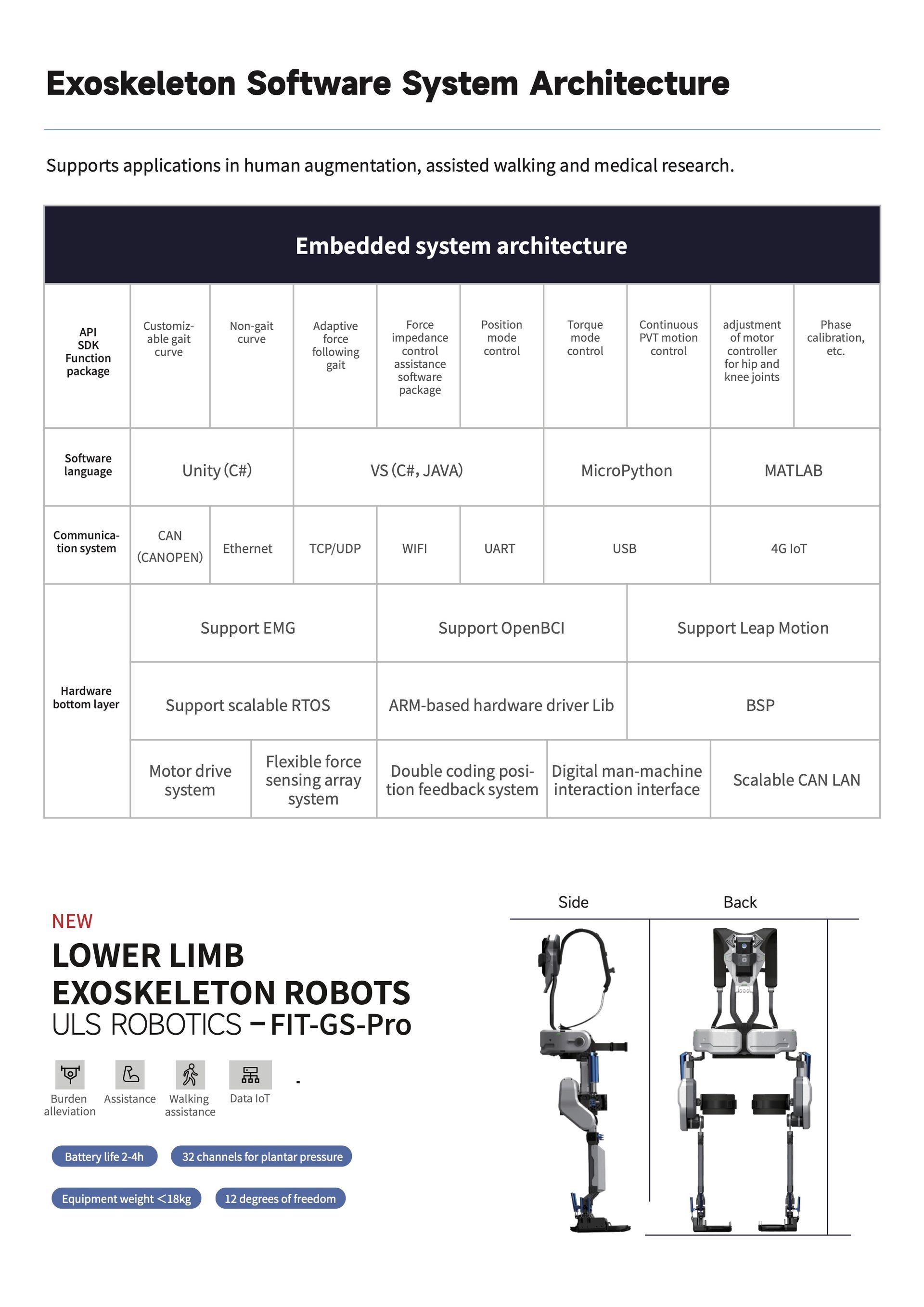 With its specialized R&D team, ULSrobotics is one of the first companies in the world to engage in the research and development of exoskeleton robots. It has extensive experience in the design and development of robot control systems, motion control algorithms, multi-sensor data fusion, human-computer interaction, machine vision, and more. The ULSrobotics exoskeleton product portfolio covers upper limbs, waist, lower limbs, and the entire body.