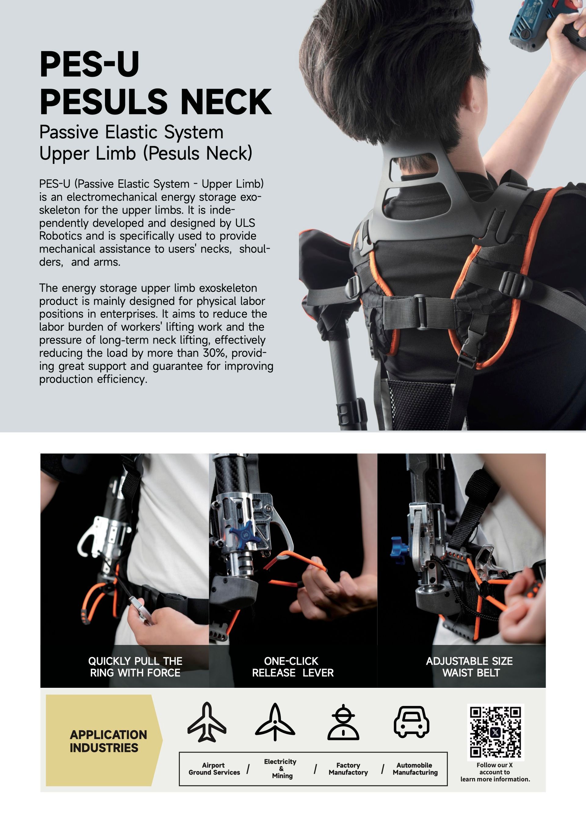The products have been awarded ISO9001 quality certification and CE safety certification. Today, ULSrobotics offers exoskeletons for a wide range of applications, such as automotive manufacturing, airport baggage handling, logistics, agriculture, viticulture, power generation, mining, and educational and research facilities.